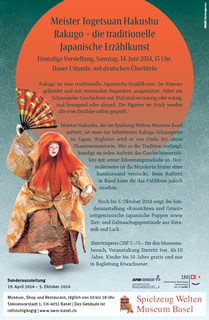 Meister Hakushu, der im Spielzeug Welten Museum Basel auftritt, ist einer der beliebtesten Rakugo-Schauspieler in Japan. Begleitet wird er von Onda Eri, einer Shamisenmeisterin. Wie es die Tradition verlangt, kündigt sie jeden Auftritt des Geschichtenerzählers mit seiner Erkennungsmelodie an. Normalerweise ist die Musikerin hinter einer Bambuswand versteckt. Beim Auftritt in Basel kann ihr das Publikum jedoch zusehen.