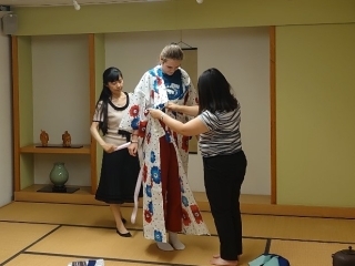 Die Teilnehmer konnten einen Yukata anprobieren.