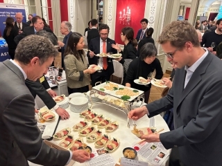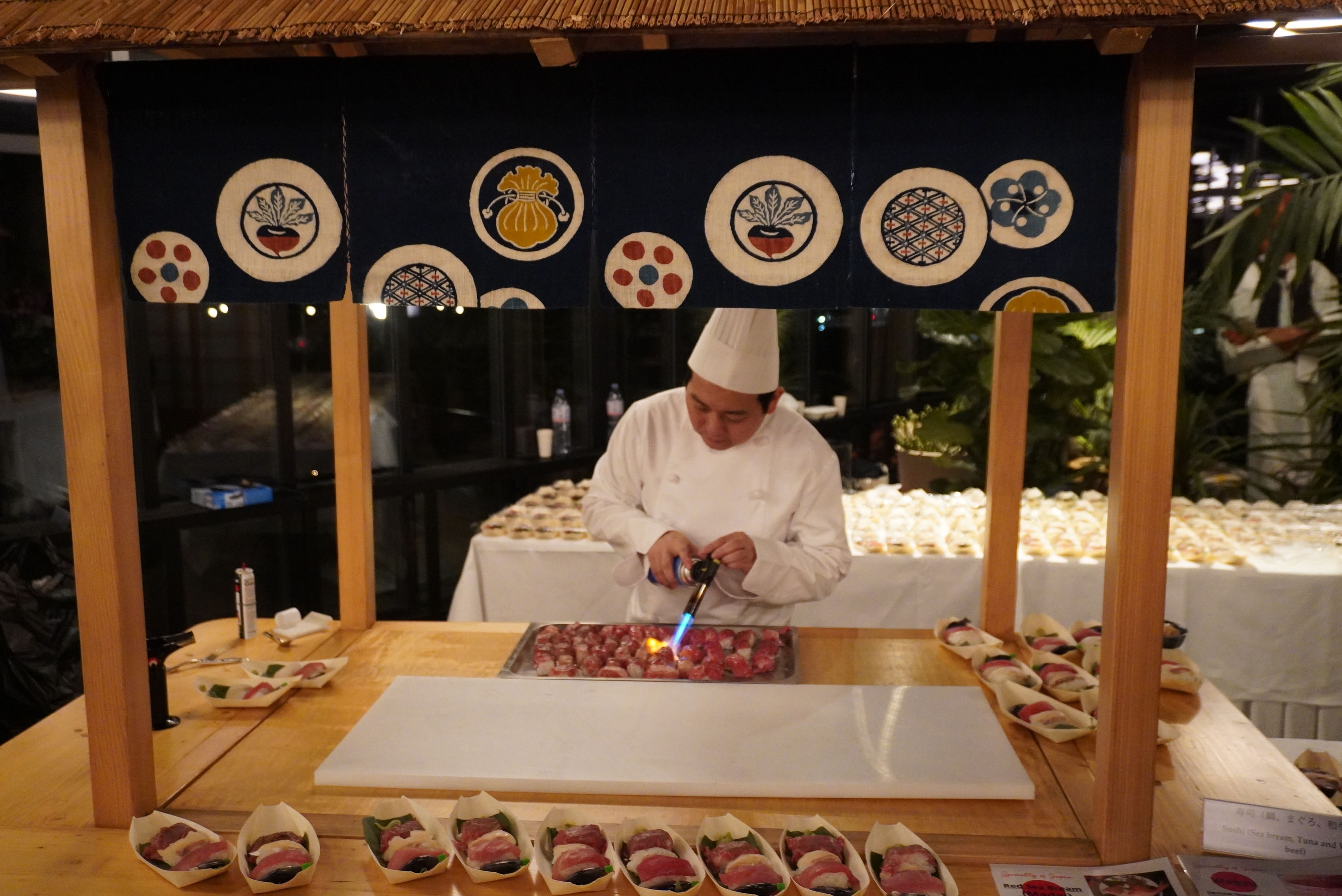 Am Veranstaltungsort wurden die Gäste von einem Ikebana Arrangement willkommen geheissen, welches von Frau Wally Gschwind, einer in der Schweiz tätigen Ikebana Lehrerin, gestaltet wurde. Darüber hinaus servierte der offizielle Chefkoch der japanischen Botschaft, HIGASHI Hisafumi, japanische Gerichte wie Sushi mit Fisch aus Japan wie zum Beispiel Dorade oder auch mit Wagyu-Rindfleisch. Ausserdem gab es Stände für Jakobsmuscheln, japanisches Wagyu-Rindfleisch und japanischen Sake, die den Gästen die delikate Küche Japans vorstellten und bei den Gästen grossen Anklang fanden.