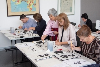 いずれの回も、元日本語教師のスルツベルガー・佐和子氏が講師を務め、冒頭日本語や日本の文字について説明し、つづいて、参加者の皆さんに、スルツベルガー氏が指導しながら、実際に筆と墨を使って和紙にご自身の名前やいくつかの日本語の文字を書いていただきました。