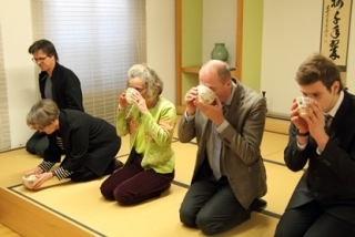 3月26日(月)当館広報文化センターにおいて、日本文化体験講習会(Japan aktiv erleben)の一環として、茶道ワークショップを開催しました。1グループ目は、シュタイガーフーベルにある学校から生徒の皆さんと引率の先生が合計26名ご参加くださいました。2グループ目に参加された皆さんは、一般募集でお集まりいただいた茶道に興味を持っている方々です。