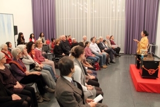 冒頭の一方井公使による挨拶に続き,向教授から,茶道の歴史や作法,現代の茶道についてレクチャーを行っていただき,抹茶についても詳しく説明していただきました。また,デモンストレーションの際には,参加者のうち一名の方に向教授がたてた抹茶を茶道の作法に従って実際に味わっていただき,その後,全ての参加者にお茶菓子と抹茶を試食・試飲していただきました。 質疑応答の時間には,参加者から多くの質問が出され,向教授から一つ一つ丁寧に回答していただきました。