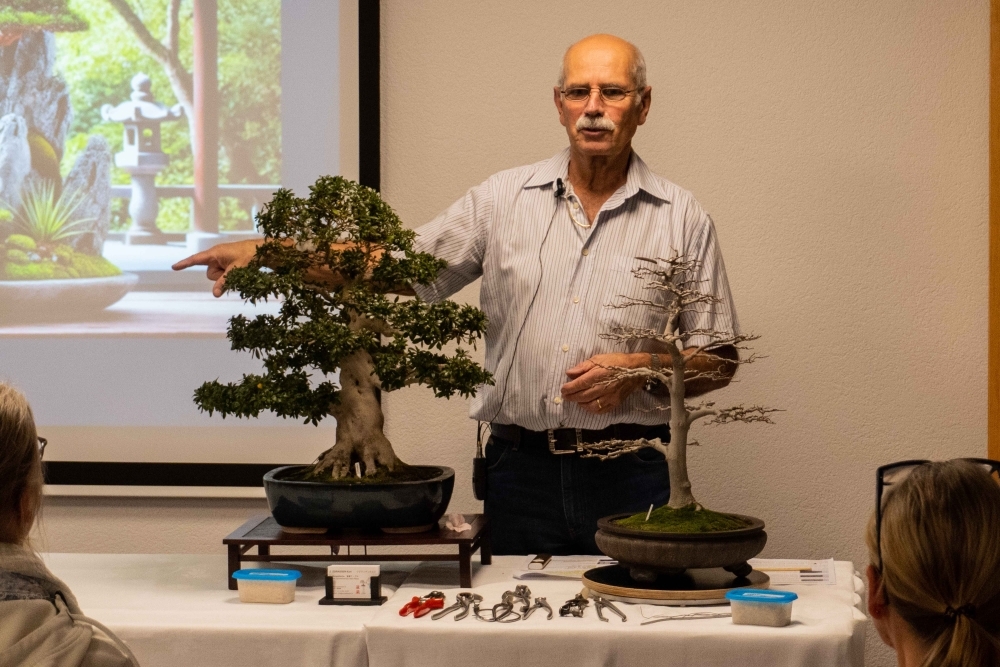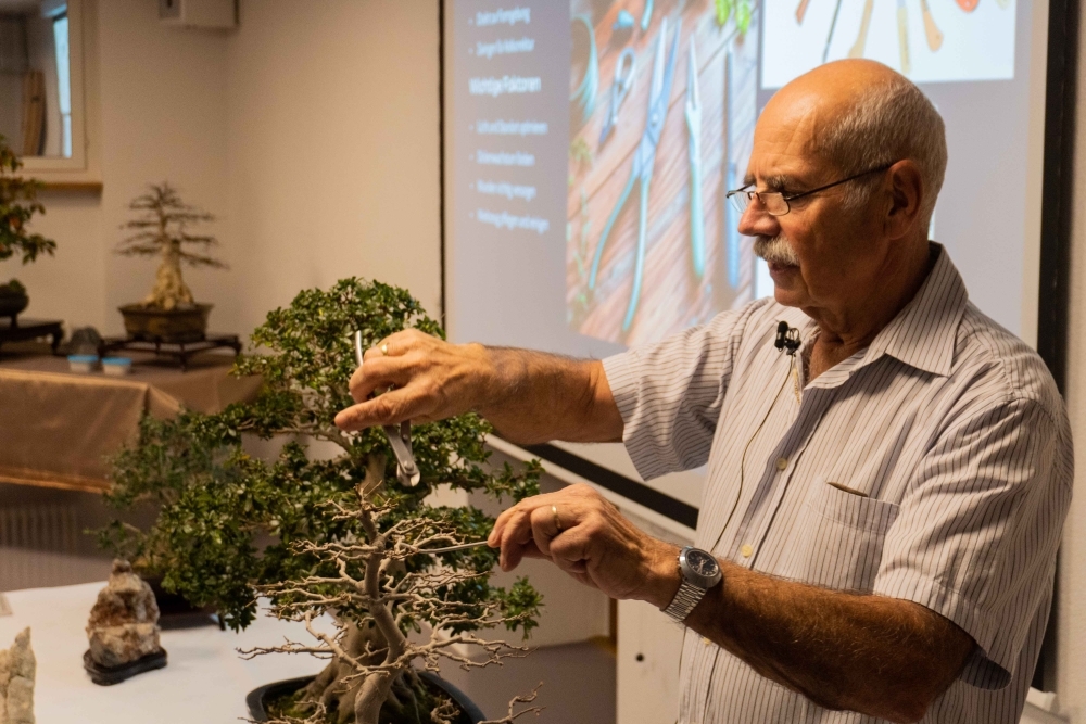 45年以上盆栽に携わり、20年に渡り盆栽クラブ・ベルンの代表を務めているクルト・ツクラゲン氏を講師に迎え、盆栽の起源をはじめ、盆栽の扱い方や手入れの仕方について説明していただきました。