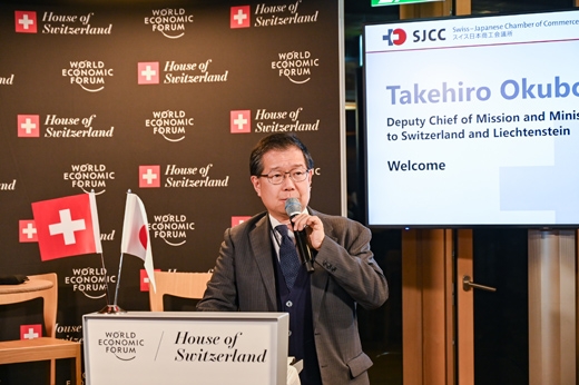 1月20日、大久保公使は、ダボスのハウス・オブ・スイス(House of Switzerland)において行われたスイス日本商工会議所(SJCC)主催のイベント「New Space Economy : Swiss research and cooperation with Japan and other countries」で挨拶し、日本とスイスの二国間関係の歴史と現状、経済関係の発展とSJCCの貢献、昨年の大阪・関西万博とスイス・パビリオンの成功、科学技術・イノベーション分野に於ける協力の展望、宇宙分野の協力のポテンシャルとSJCCへの期待等について述べました。
